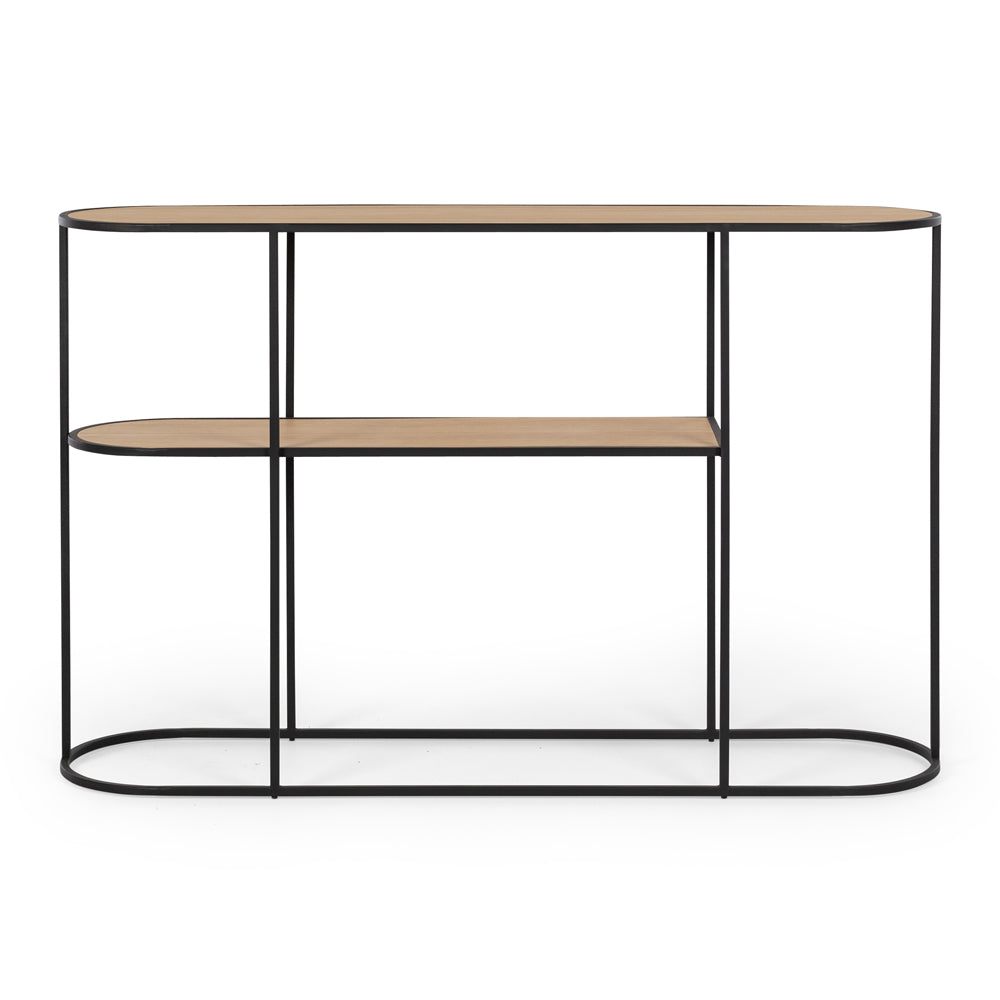 Construction: Oak veneers, powder-coated metal, countersunk shelving